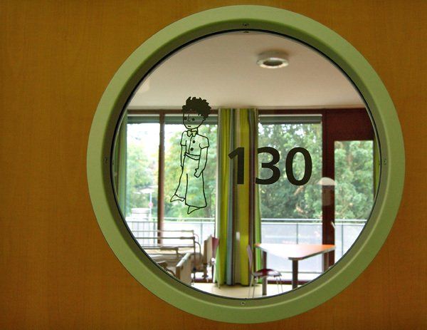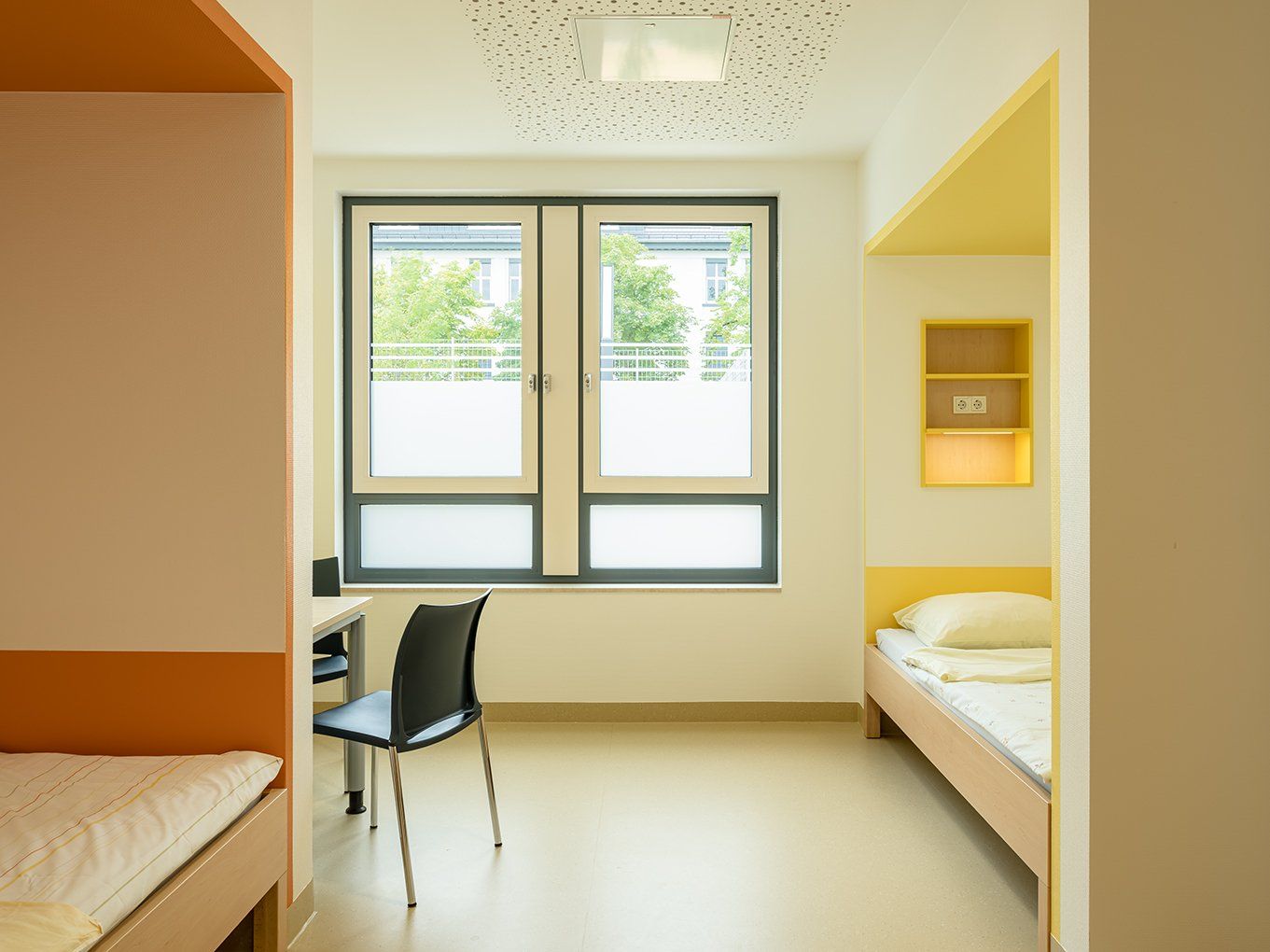 In Gebäude 1 befinden sich 3 Stationen mit jeweils 20 Betten. Pro Station wird über die Winkelform eine Aufteilung in 2 Gruppen möglich. Die Kinder werden aufgeteilt in die Altersgruppen 5-11 Jahre im Erdgeschoss, 12-15 Jahre im 1. OG, 16-18 Jahre im 2. OG.