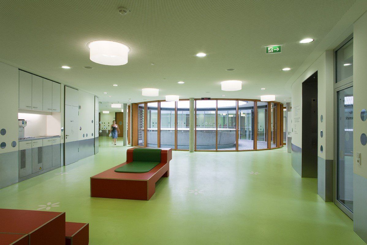 Das 3. Obergeschoss beherbergt die Schule für die Kinder und die Ambulanz. Im 1. und 2. OG sind die 4 Stationen untergebracht. In der Eingangsebene sind die Therapiebereiche, die Informationstheke und ein multifunktionaler Aufenthaltsbereich mit Küche sowie die Notaufnahme und die Verwaltung der KJP.