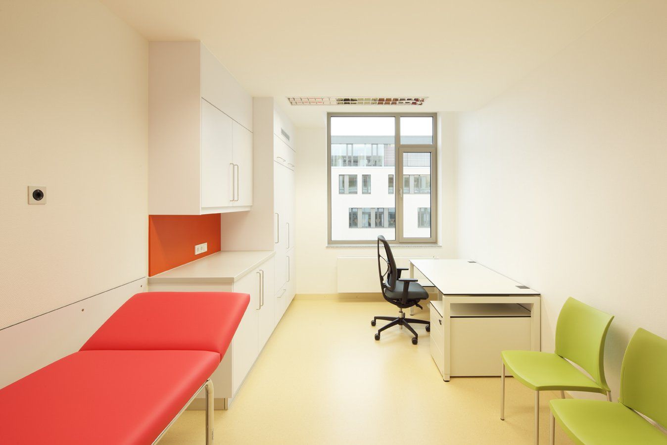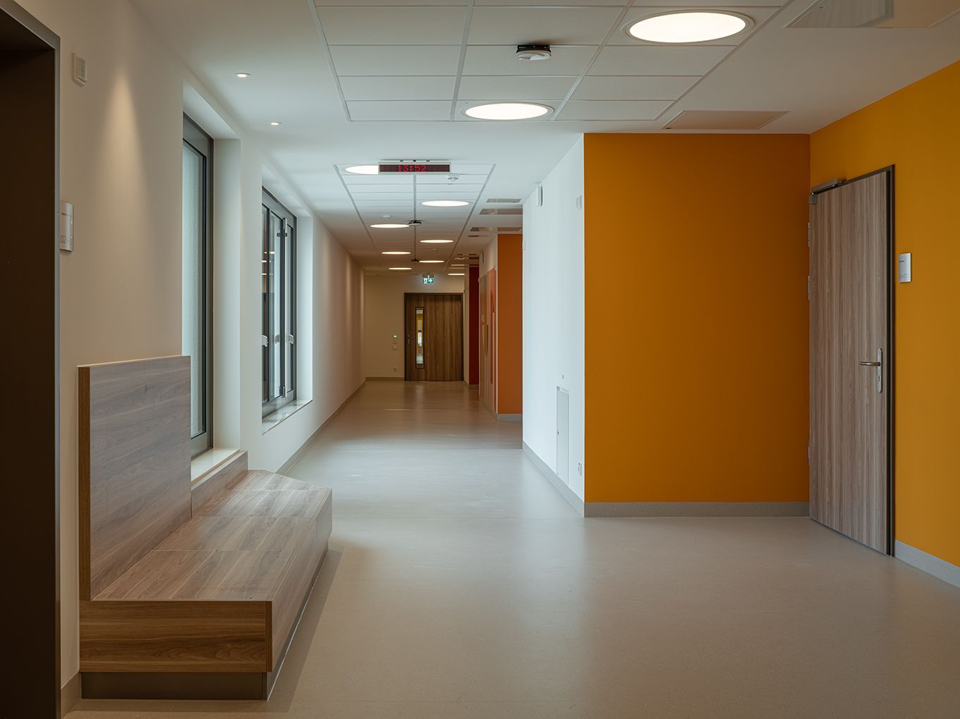 In der Neubaumaßnahme des 1. Bauabschnitts der Darmstädter Kinderkliniken sind die Allgemein- und Intensivpflege, die Schule für Kranke sowie Untersuchungs- und Behandlungsbereiche untergebracht.