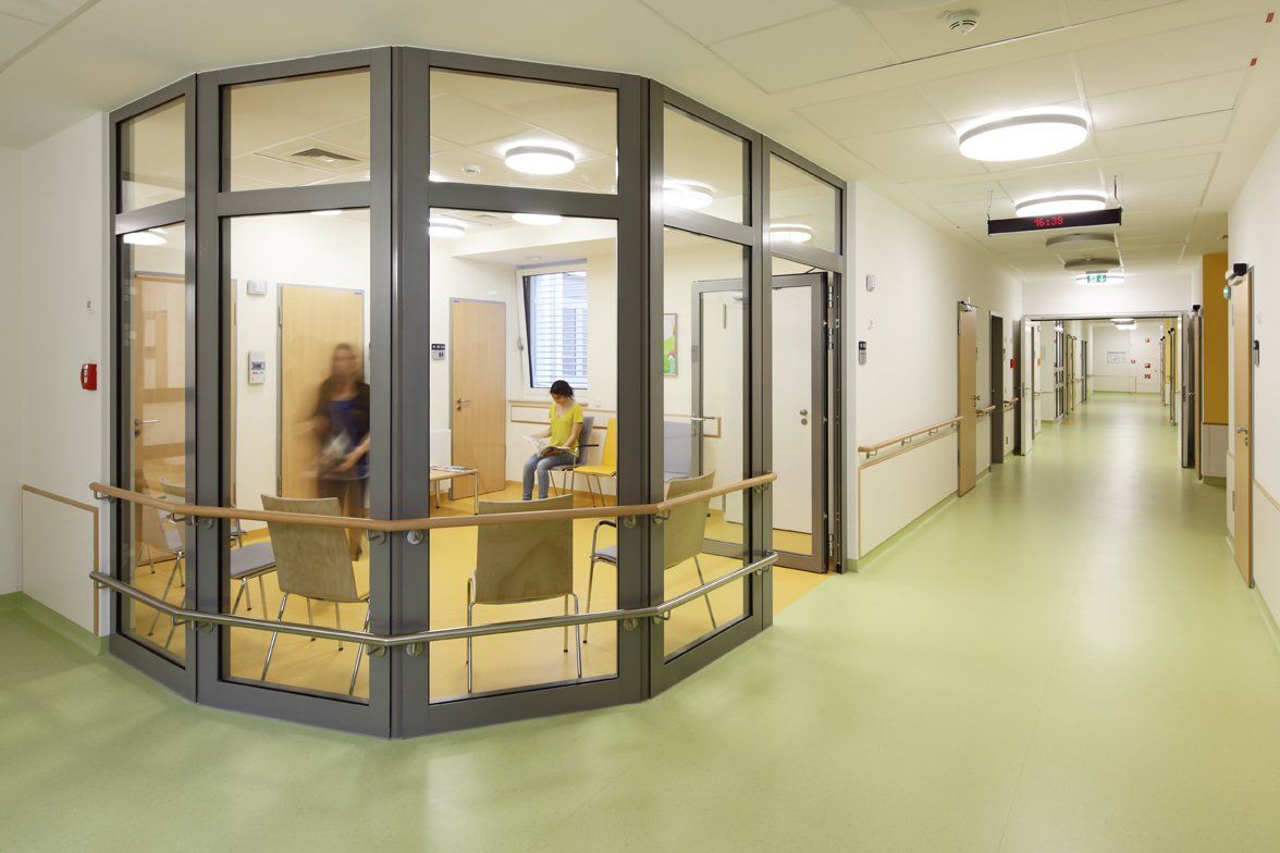 Die Teilung einer Station in 2 Gruppen wurde hier durch eine Doppelflurlösung mit integrierten Innenhöfen verwirklicht. Die gemeinsam zu nutzenden Räume einer Station liegen in der mittleren Zone und können von den jeweiligen Gruppenfluren erschlossen werden.